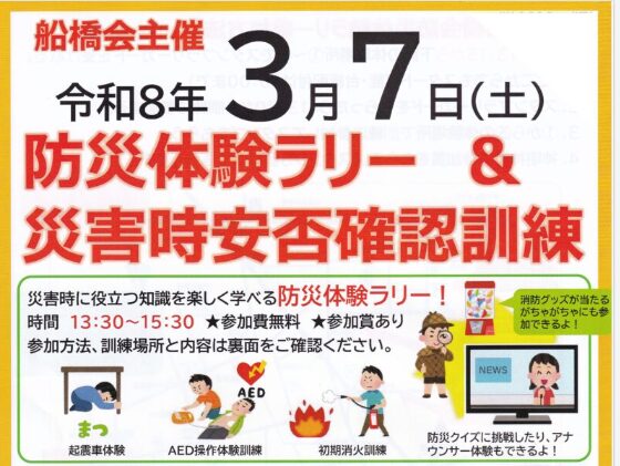 船橋会は、令和8年3月7日、防災体験ラリー&災害時安否確認訓練を実施します。隣近所助け合える関係を目 …