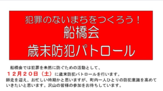 船橋会では犯罪を未然に防ぐための活動として12月20日(土)に歳末防犯パトロールを行います。師走を迎え、お忙しい時期かと思いますが、町内一人ひとりの防犯意識を高めていきたいと思います。沢山の皆様の参加をお待ちしています。