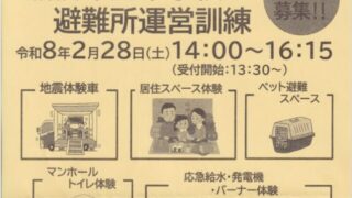 2月28日(土)、14:00~16:15(受付:13:30~)、船橋希望中学校避難所運営訓練(主催:船橋希望中学校避難所運営委員会)が実施されます。※船橋希望中学校は、船橋6丁目26番、船橋7丁目全域、船橋4丁目1~22・28~30番にお住...