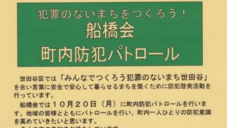 お知らせ 町内防犯パトロールを実施します(10/20) 世田谷区では「みんなでつくろう犯罪のないまち世田谷」を合言葉に安全で安心して暮らせるまちを築くために防犯啓発活動を行っています。船橋会では10月20日(月)に町内防犯パトロールを行います。地域の皆様とともにパトロールを行い、町内一人ひとりの... 2025.10.06 お知らせ船橋会活動予定(地域の情報)警察