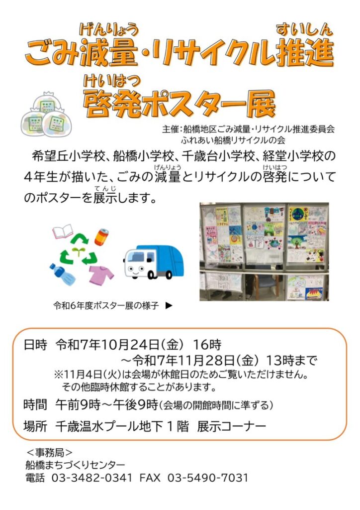 希望丘小学校、船橋小学校、千歳台小学校、経堂小学校の4年生が描いた、ごみの減量とリサイクルの啓発についてのポスターを展示します。