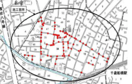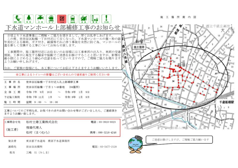 船橋1丁目エリアにおける下水道マンホール上部補修工事(マンホールの蓋を新しく交換)のお知らせです。