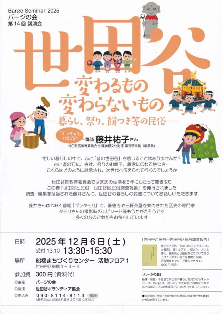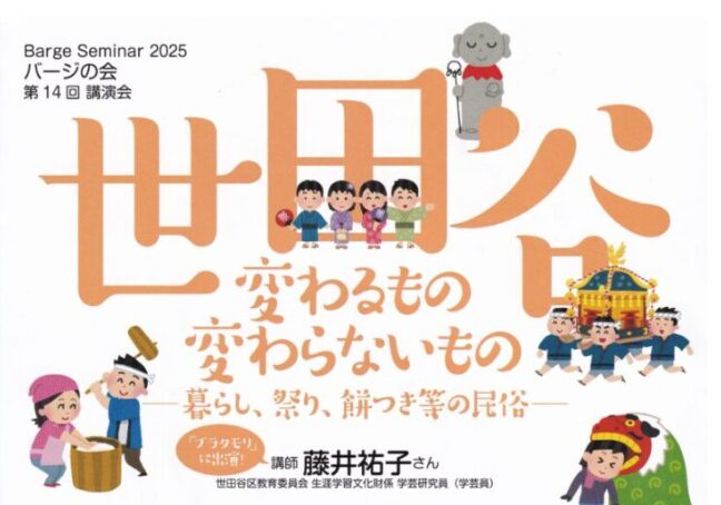 「世田谷変わるもの変わらないもの」(バージの会・第14回講演会)のお知らせ 2025.10.24 「ブラタモリ」にも出演された藤井祐子さん(世田谷区教育委員会生涯学習文化財係学芸研究員)の講演会です。 聴講ご希望の方は、090-8114-8113(稲垣)までご連絡ください。