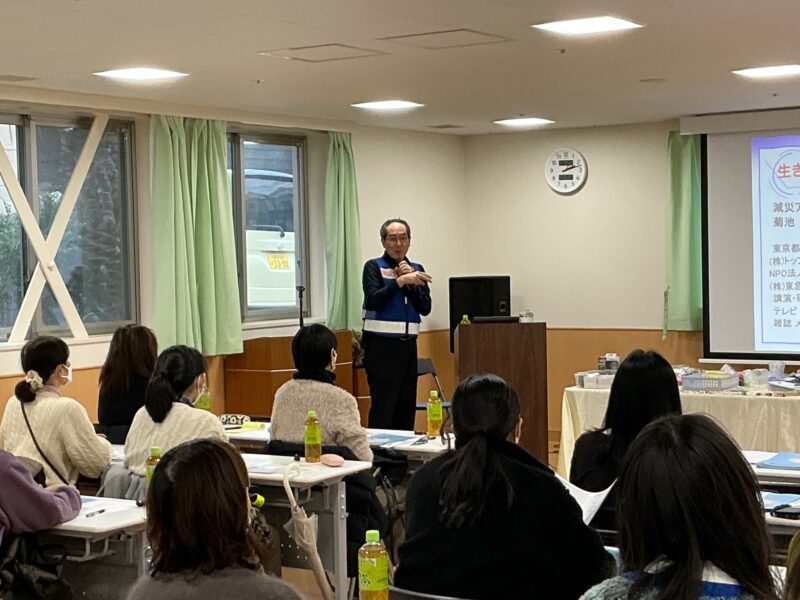菊池顕太郎氏(減災・防犯アドバイザー)から、大災害時の厳しい環境の中で、人間とペットがともに生き抜くための手段と、そのための日頃の準備について熱気あふれるレクチャーをして頂きました。