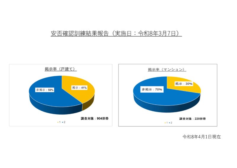 今回は、安否確認カードの他に、事前に配布した安否確認用チラシや目立ちやすい布(できれば黄色)での掲示をお願いしました。
